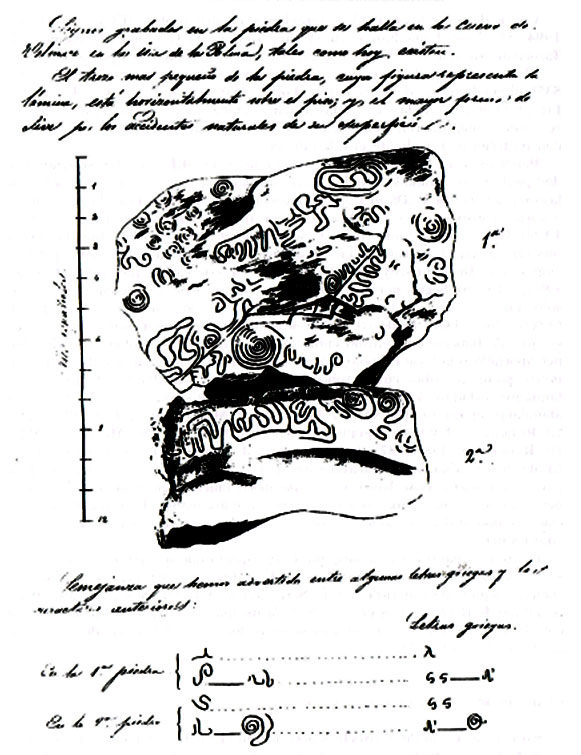 In den ältesten Interpretationen waren die Felsgravuren nur „reine Kritzeleien, zufällige Spielereien oder die Phantasieerzeugnisse der barbarischen Ureinwohner (Viera y Clavijo, 1950 / 1772-17732Viera y Clavijo, José de (1772-1773). Historia de Canarias. Noticias de la historia general de las Islas Canarias. Goya-Ediciones. 1950. Santa Cruz de Tenerife. Tomo I. Pág. 146.). „Am 6. August 1794 bemerkte der weise Bischof Antonio Tavira y Almazán in den Zeichnungen von Belmaco, dass … diese Schriftzeichen von phönizischen Abenteurern erstellt worden sein könnten“ (Hernández Pérez, 19723Hernández Pérez, Mauro S. (1972). Contribución a la Carta Arqueológica de la isla de La Palma (Canarias). Anuario de Estudios Atlánticos, XVIII. Madrid – Las Palmas. Pág. 573).